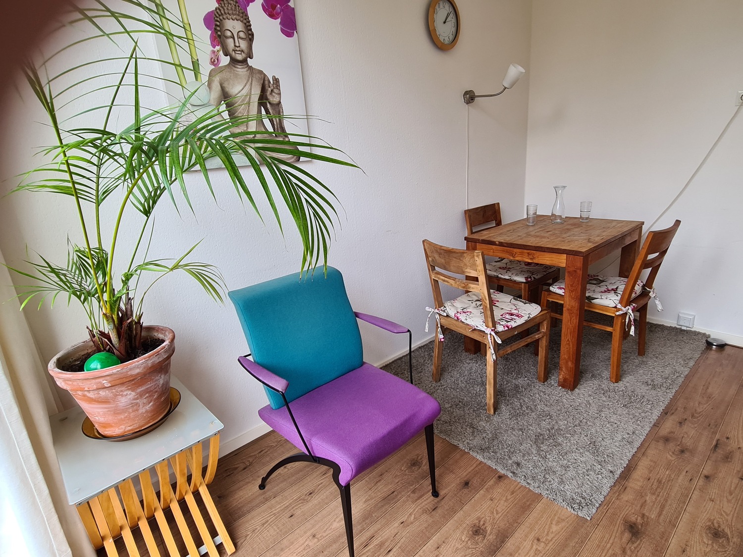 In een kamer staan een tafel met 3 stoelen, en gemakkelijke stoelen. Deze kamer is voorzien van infrarood warmtepanelen, die extra comfort geven bij b.v. massages.