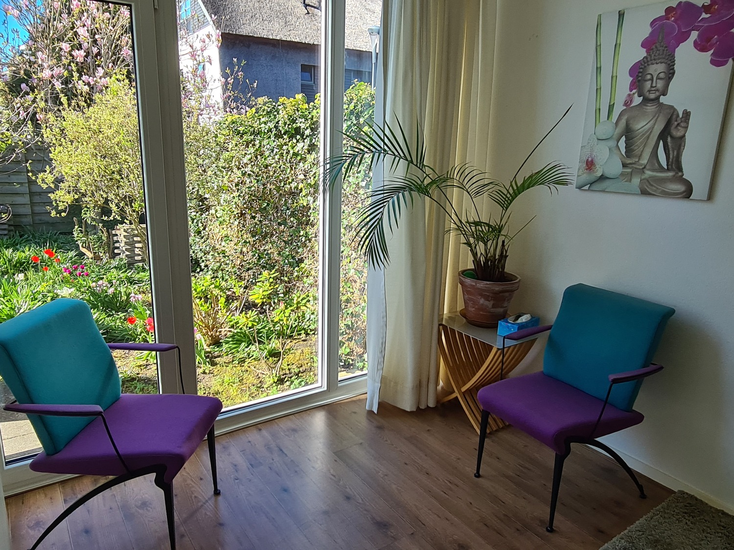 De spreekkamers liggen aan de achterzijde van het pand en kijken uit op de achtertuin. In 2026 zijn de kozijnen vernieuwd en voorzien van triple glas.